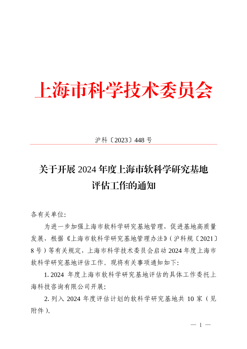 为进一步加强上海市软科学研究基地管理,促进基地高质量发展,根据《上海市软科学研究基地管理办法》(沪科规〔2021〕8号)等有关规定,上海市科学技术委员会启动2024年度上海市软科学研究基地评估工作。现将有关事项通知如下: