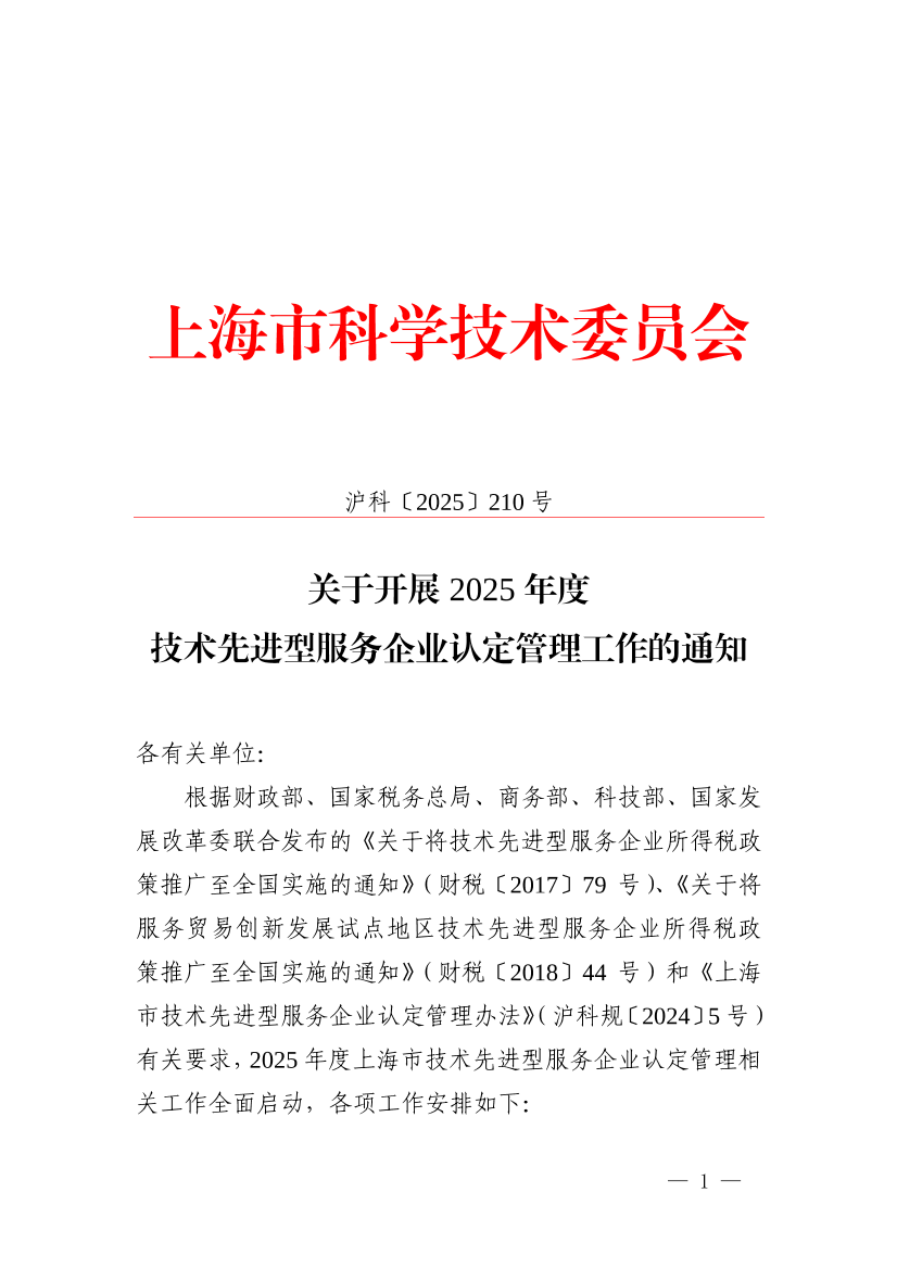 根据财政部、国家税务总局、商务部、科技部、国家发展改革委联合发布的《关于将技术先进型服务企业所得税政策推广至全国实施的通知》(财税〔2017〕79号)、《关于将服务贸易创新发展试点地区技术先进型服务企业所得税政策推广至全国实施的通知》(财税〔2018〕44号)和《上海市技术先进型服务企业认定管理办法》(沪科规〔2024〕5号)有关要求,2025年度上海市技术先进型服务企业认定管理相关工作全面启动,各项工作安排如下: