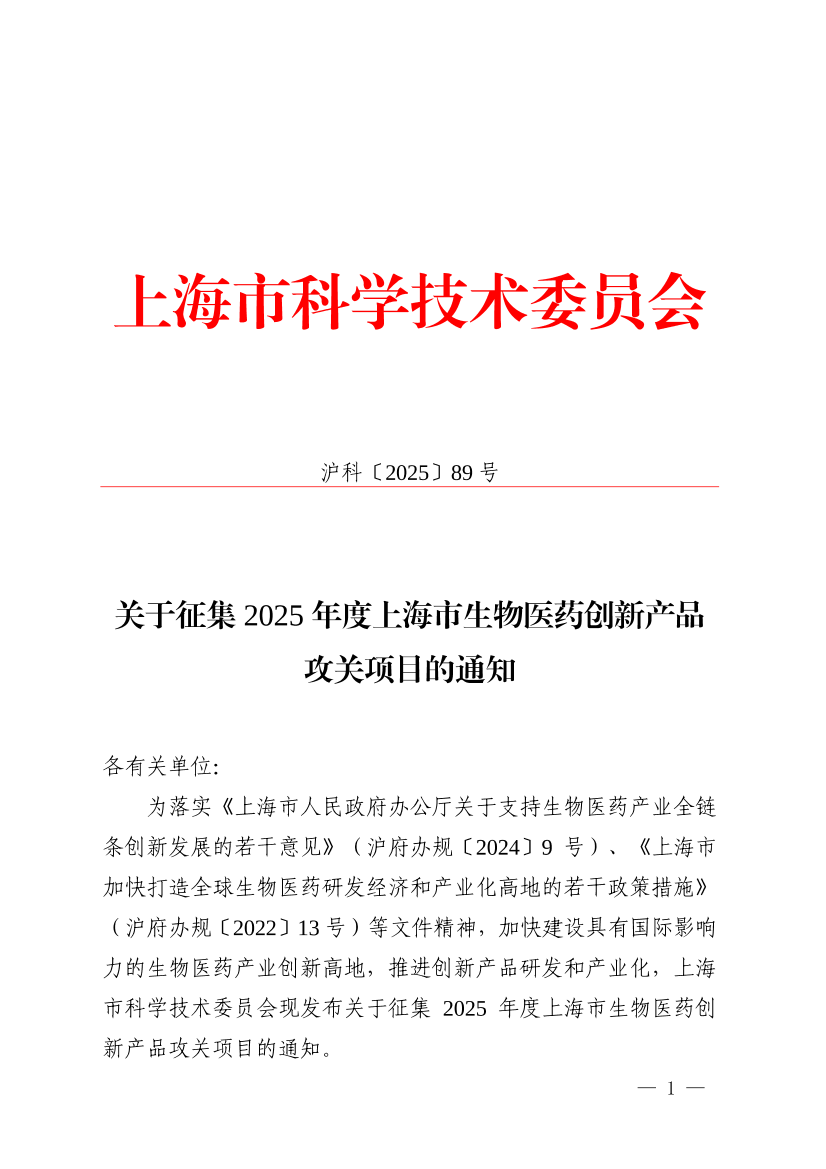 为落实《上海市人民政府办公厅关于支持生物医药产业全链条创新发展的若干意见》(沪府办规〔2024〕9号)、《上海市加快打造全球生物医药研发经济和产业化高地的若干政策措施》(沪府办规〔2022〕13号)等文件精神,加快建设具有国际影响力的生物医药产业创新高地,推进创新产品研发和产业化,上海市科学技术委员会现发布关于征集2025年度上海市生物医药创新产品攻关项目的通知。