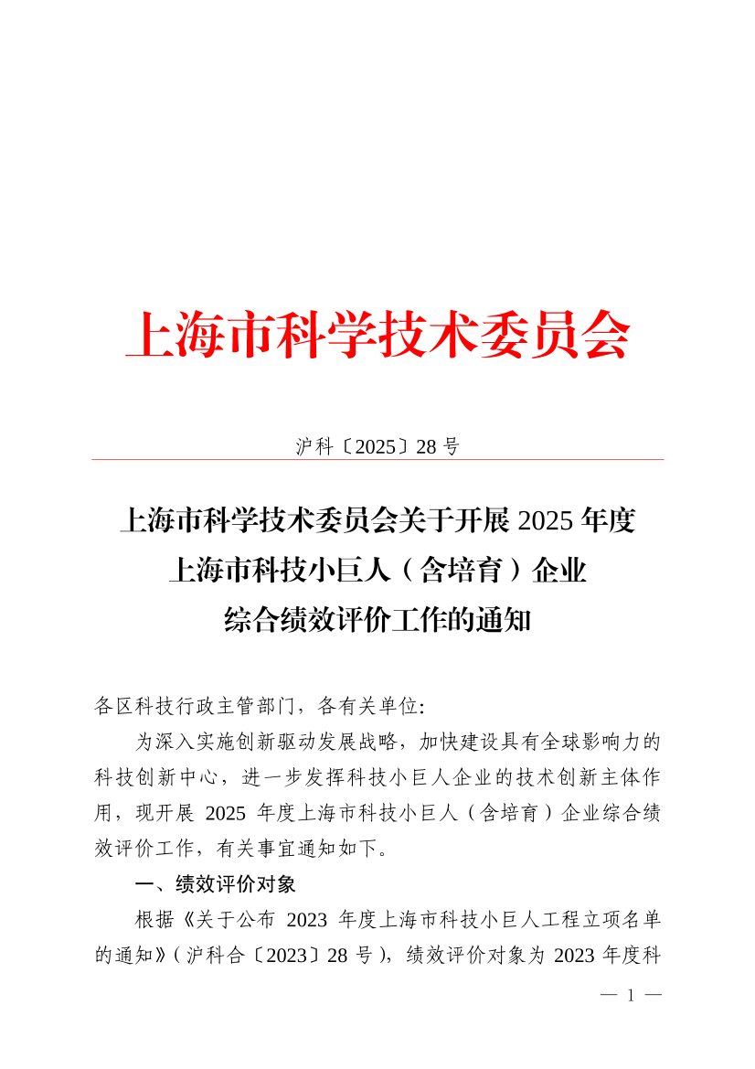 为深入实施创新驱动发展战略,加快建设具有全球影响力的科技创新中心,进一步发挥科技小巨人企业的技术创新主体作用,现开展2025年度上海市科技小巨人(含培育)企业综合绩效评价工作,有关事宜通知如下。