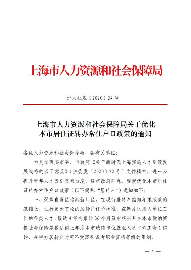 为贯彻落实市委、市政府《关于新时代上海实施人才引领发展战略的若干意见》(沪委发〔2020〕22号)文件精神,进一步提升青年人才吸引集聚力度,经市政府同意,现就优化本市居住证转办常住户口政策(以下简称“居转户”)通知如下: