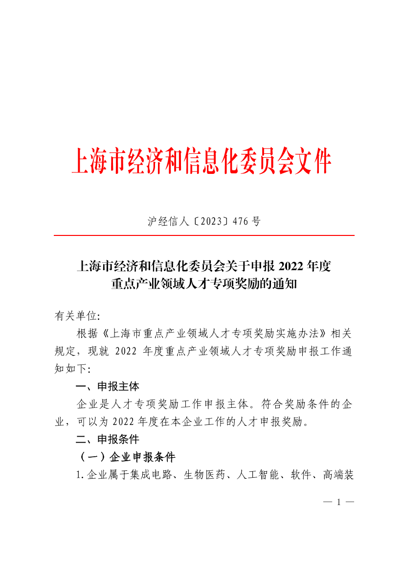 根据《上海市重点产业领域人才专项奖励实施办法》相关规定,现就2022年度重点产业领域人才专项奖励申报工作通知如下: