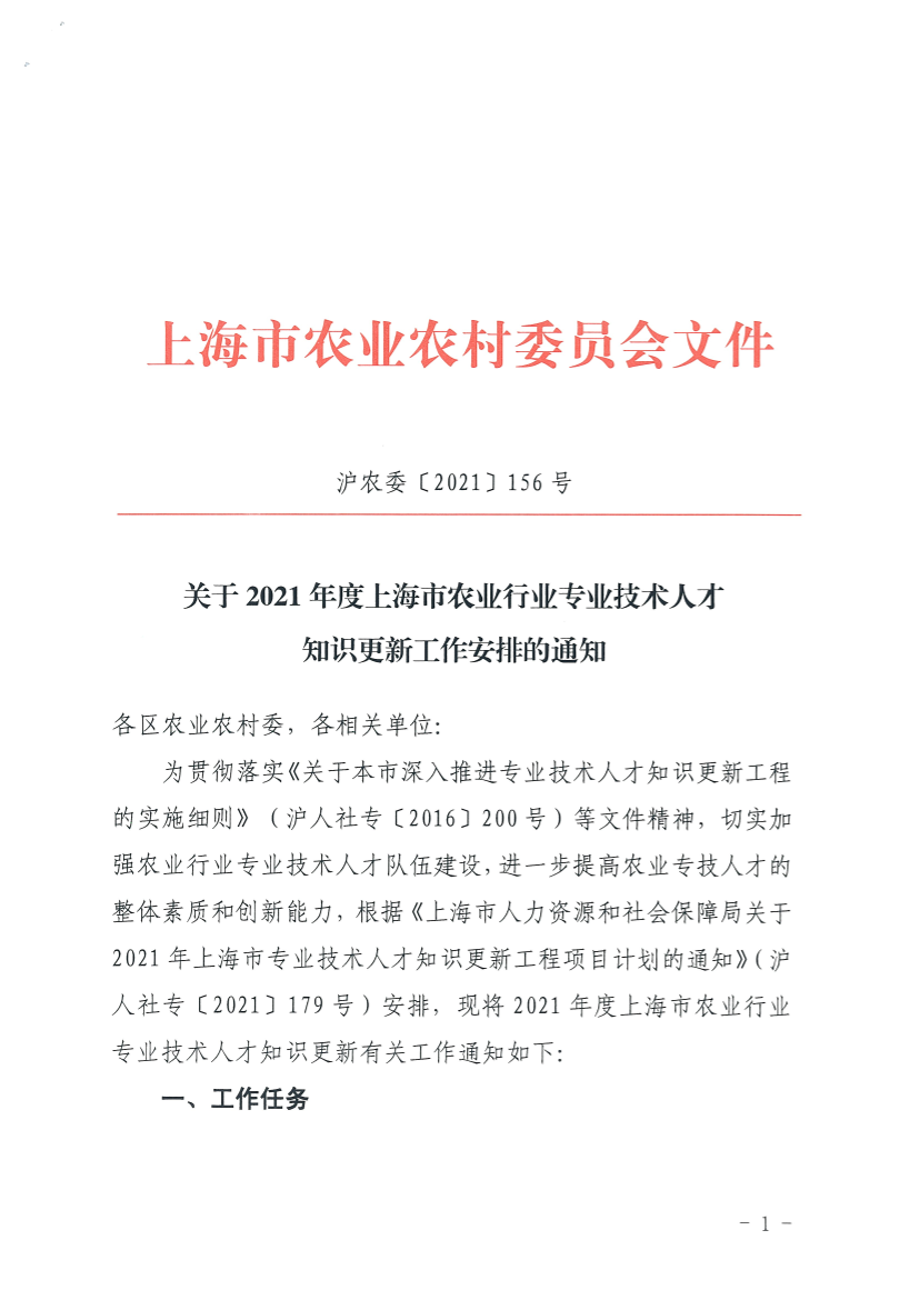 为贯彻落实《关于本市深入推进专业技术人才知识更新工程的实施细则》(沪人社专〔2016〕200号)等文件精神,切实加强农业行业专业技术人才队伍建设,进一步提高农业专技人才的整体素质和创新能力,根据《上海市人力资源和社会保障局关于2021年上海市专业技术人才知识更新工程项目计划的通知》(沪人社专〔2021〕179号)安排,现将2021年度上海市农业行业专业技术人才知识更新有关工作通知如下: