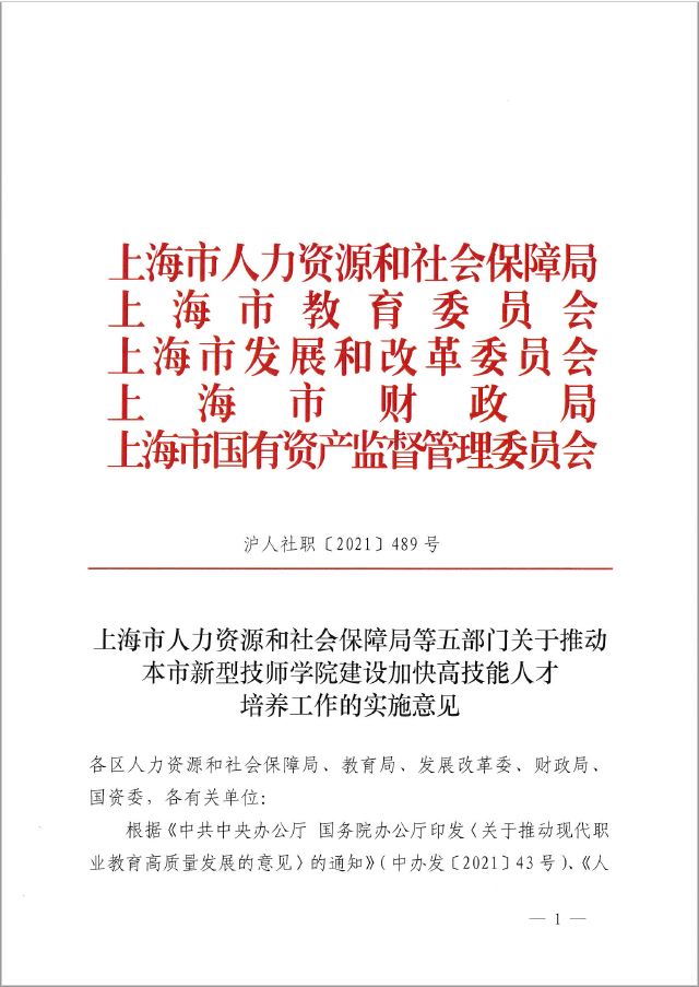 根据《中共中央办公厅 国务院办公厅印发〈关于推动现代职业教育高质量发展的意见〉的通知》(中办发〔2021〕43号)、《人力资源社会保障部 国家发展改革委 财政部关于深化技工院校改革 大力发展技工教育的意见》(人社部发〔2021〕30号)等文件精神,现就推动本市新型技师学院高水平建设和高质量发展,加快高技能人才队伍建设,提出如下实施意见。
