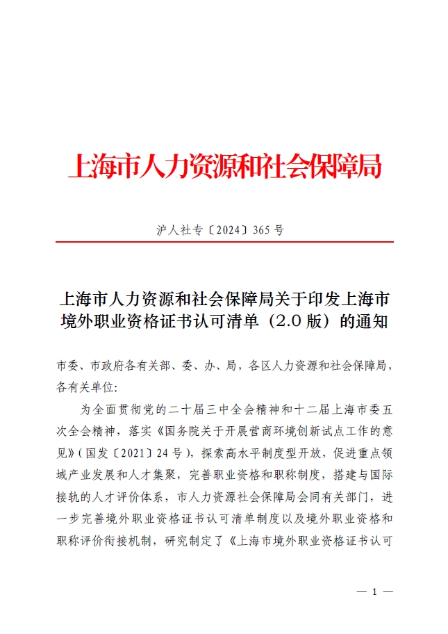 为全面贯彻党的二十届三中全会精神和十二届上海市委五次全会精神,落实《国务院关于开展营商环境创新试点工作的意见》(国发〔2021〕24号),探索高水平制度型开放,促进重点领域产业发展和人才集聚,完善职业资格和职称制度,搭建与国际接轨的人才评价体系,市人力资源社会保障局会同有关部门,进一步完善境外职业资格证书认可清单制度以及境外职业资格和职称评价衔接机制,研究制定了《上海市境外职业资格证书认可清单(2.0版)》(以下简称《清单》,见附件1),并分层分类配套相关政策措施。现将有关事项通知如下: