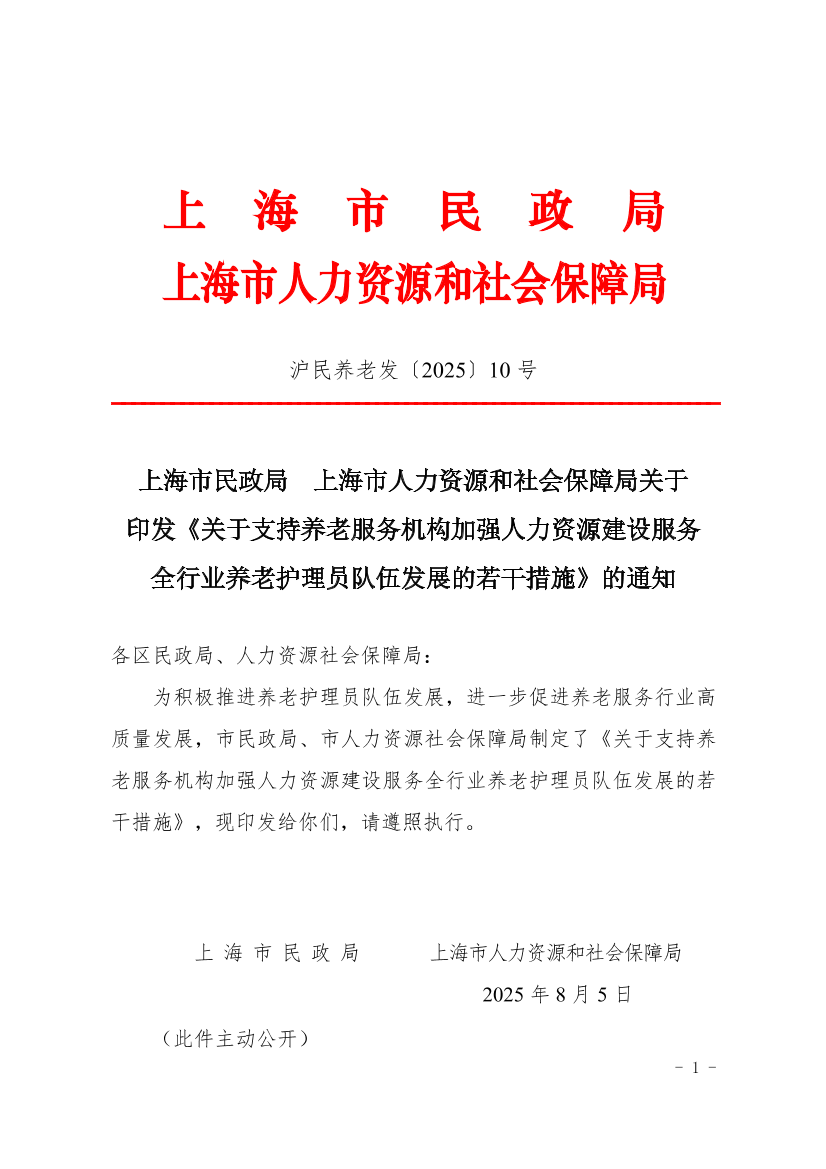 关于支持养老服务机构加强人力资源建设服务全行业养老护理员队伍发展的若干措施