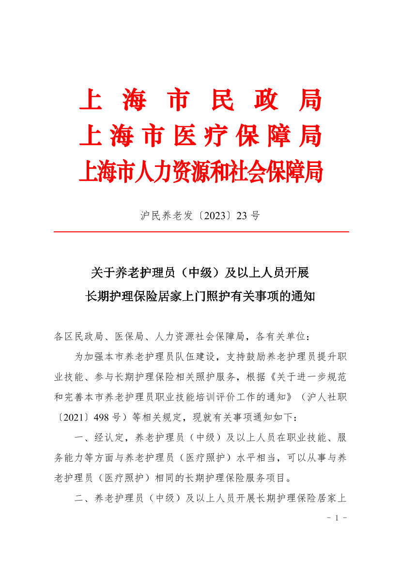 关于养老护理员(中级)及以上人员开展长期护理保险居家上门照护有关事项的通知