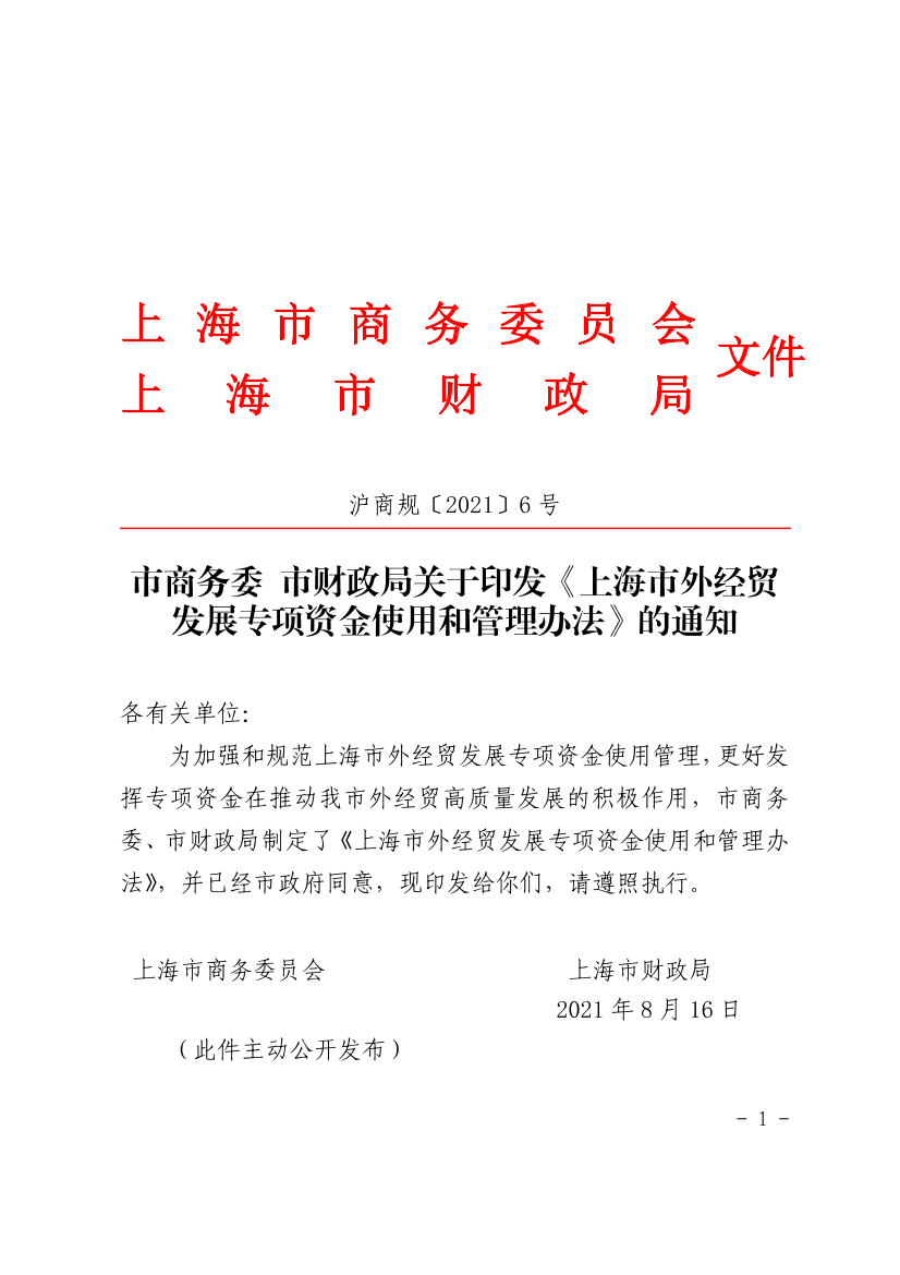 为加强和规范上海市外经贸发展专项资金使用管理,更好发挥专项资金在推动我市外经贸高质量发展的积极作用,市商务委、市财政局制定了《上海市外经贸发展专项资金使用和管理办法》,并已经市政府同意,现印发给你们,请遵照执行。