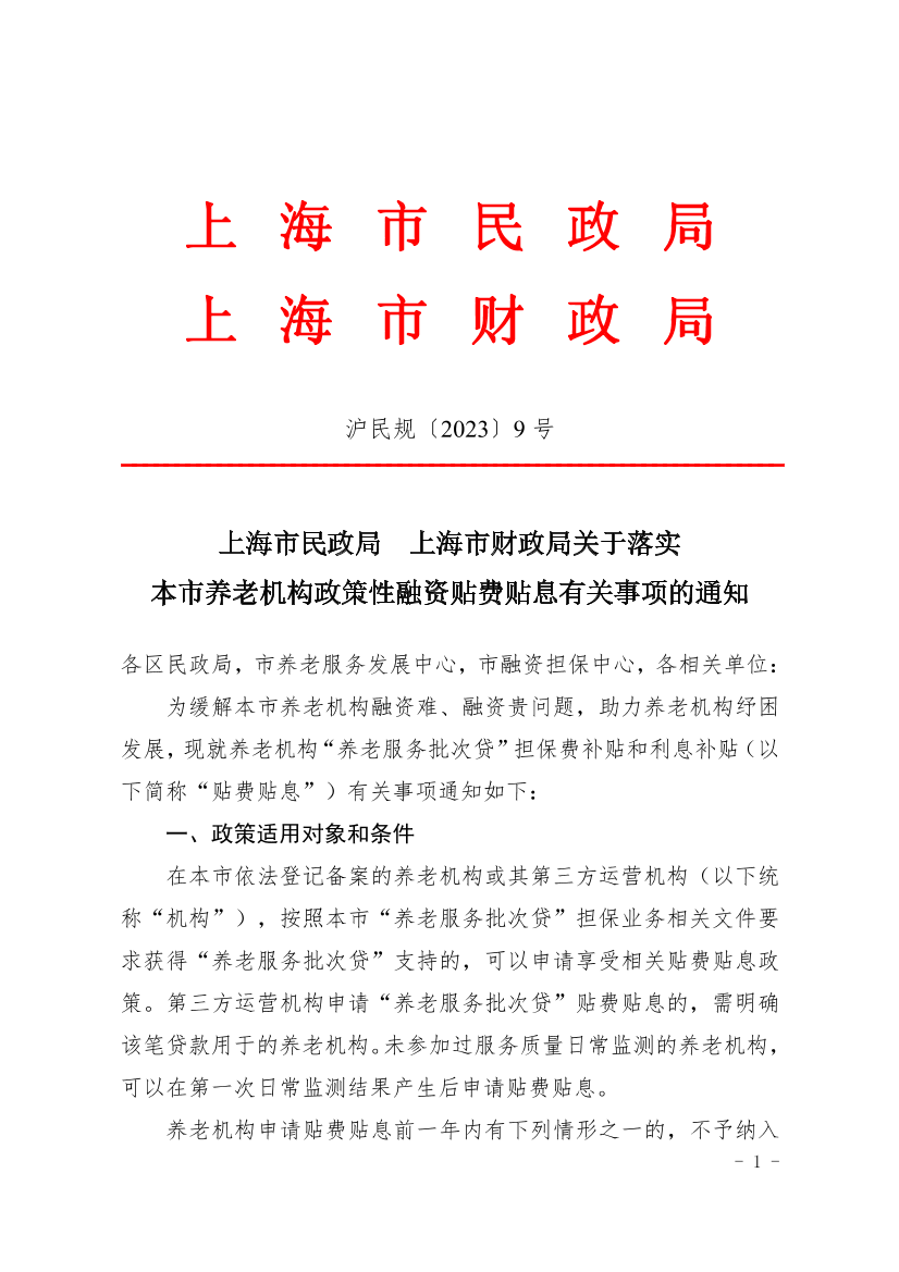 为缓解本市养老机构融资难、融资贵问题,助力养老机构纾困发展,现就养老机构“养老服务批次贷”担保费补贴和利息补贴(以下简称“贴费贴息”)有关事项通知如下: