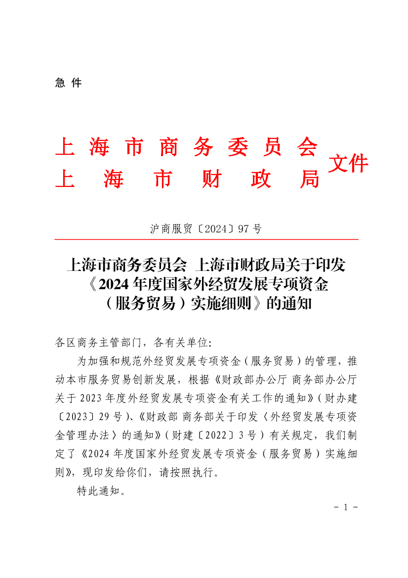 为加强和规范外经贸发展专项资金(服务贸易)的管理,推动本市服务贸易创新发展,根据《财政部办公厅 商务部办公厅关于2023年度外经贸发展专项资金有关工作的通知》(财办建〔2023〕29号)、《财政部 商务部关于印发〈外经贸发展专项资金管理办法〉的通知》(财建〔2022〕3号)有关规定,我们制定了《2024年度国家外经贸发展专项资金(服务贸易)实施细则》,现印发给你们,请按照执行。
