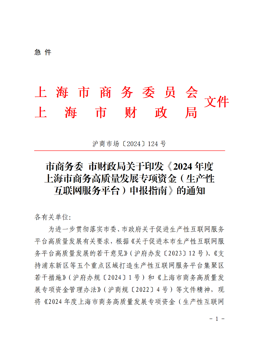 为进一步贯彻落实市委、市政府关于促进生产性互联网服务平台高质量发展有关要求,根据《关于促进本市生产性互联网服务平台高质量发展的若干意见》(沪府办发〔2023〕12号)、《支持浦东新区等五个重点区域打造生产性互联网服务平台集聚区若干措施》(沪府办规〔2024〕1号)和《上海市商务高质量发展专项资金管理办法》(沪商规〔2022〕4号)等文件精神,现将《2024年度上海市商务高质量发展专项资金(生产性互联网服务平台)申报指南》印发给你们,请按照要求做好相关申报工作。