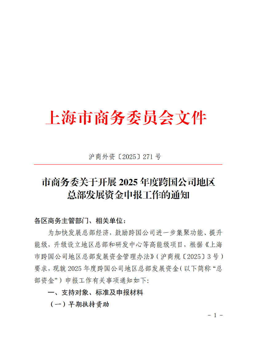 为加快发展总部经济,鼓励跨国公司进一步集聚功能、提升能级,升级设立地区总部和研发中心等高能级项目,根据《上海市跨国公司地区总部发展资金管理办法》(沪商规〔2025〕3号)要求,现就2025年度跨国公司地区总部发展资金(以下简称“总部资金”)申报工作有关事项通知如下: