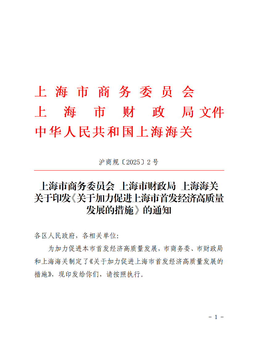 为加力促进本市首发经济高质量发展,市商务委、市财政局和上海海关制定了《关于加力促进上海市首发经济高质量发展的措施》,现印发给你们,请按照执行。