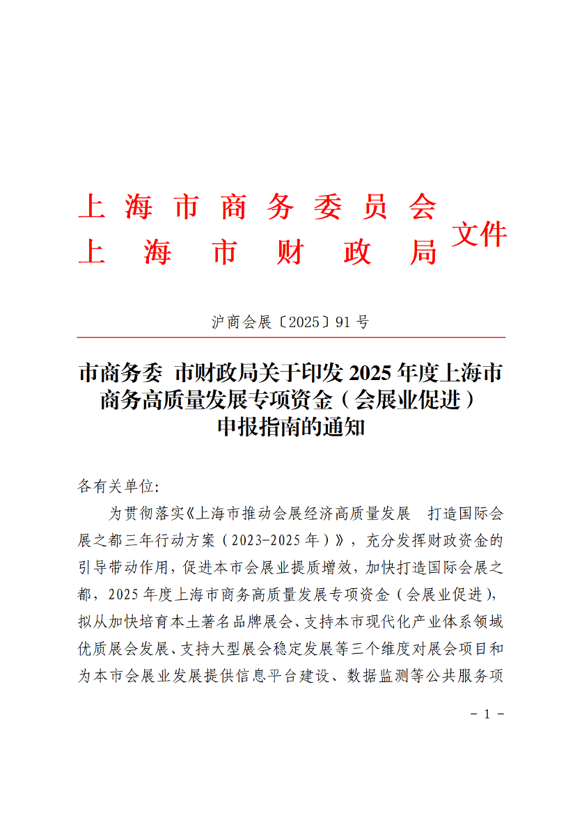 现将《2025年度上海市商务高质量发展专项资金(会展业促进)申报指南》印发给你们,请按照指南要求做好相关申报工作。