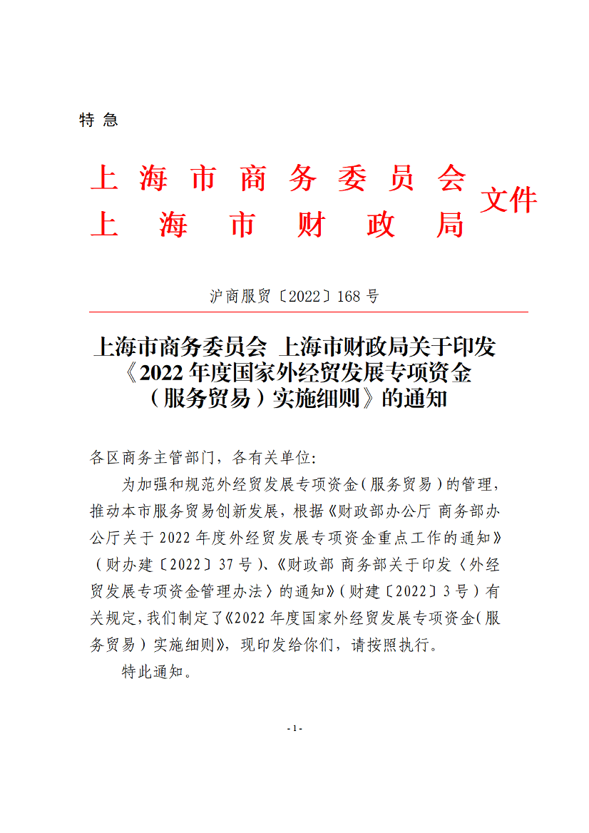 根据《财政部办公厅商务部办公厅关于2022年度外经贸发展专项资金重点工作的通知》(财办建〔2022〕37号)、《财政部商务部关于印发〈外经贸发展专项资金管理办法〉的通知》(财建〔2022〕3号)有关规定,为了加强和规范外经贸发展专项资金(服务贸易)(以下简称“专项资金”)的管理,促进本市服务贸易创新发展,特制定本细则。