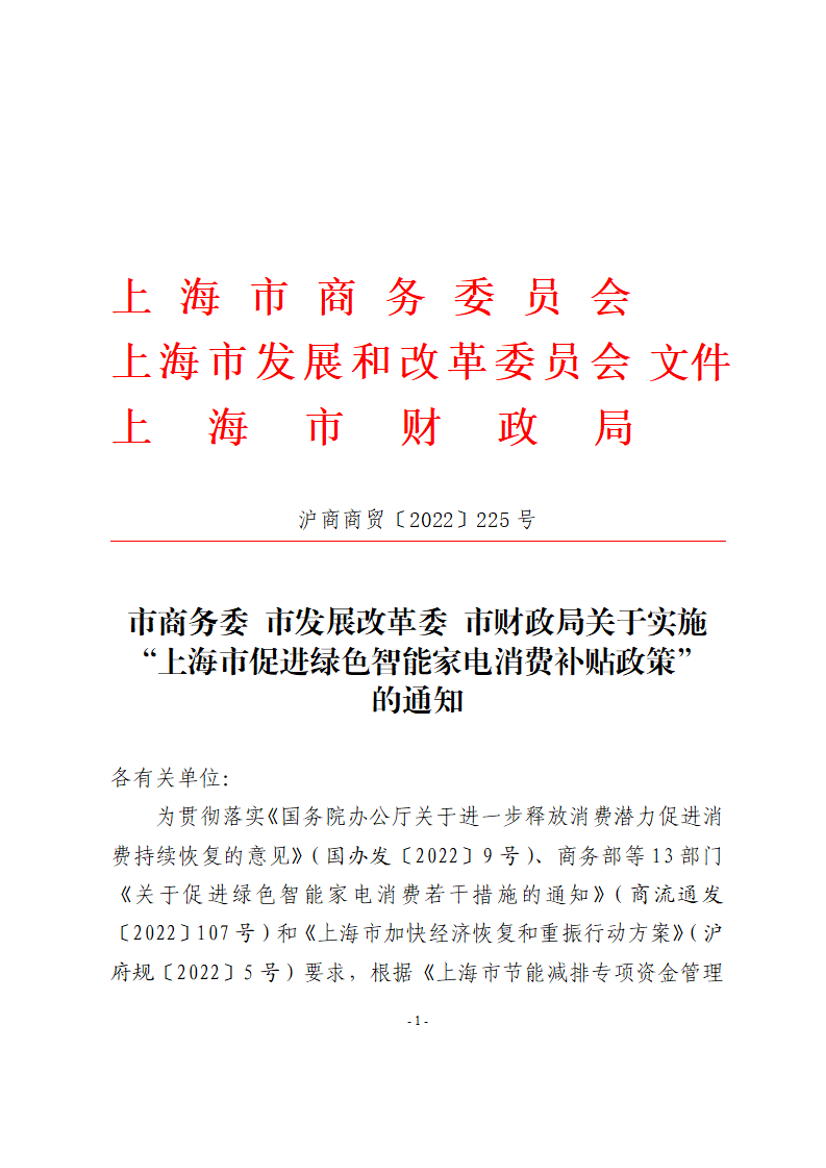 为贯彻落实《国务院办公厅关于进一步释放消费潜力促进消费持续恢复的意见》(国办发〔2022〕9号)、商务部等13部门《关于促进绿色智能家电消费若干措施的通知》(商流通发〔2022〕107号)和《上海市加快经济恢复和重振行动方案》(沪府规〔2022〕5号)要求,根据《上海市节能减排专项资金管理办法》,经市政府同意,市商务委、市发展改革委和市财政局决定实施促进绿色智能家电消费补贴政策。现将有关事项通知如下: