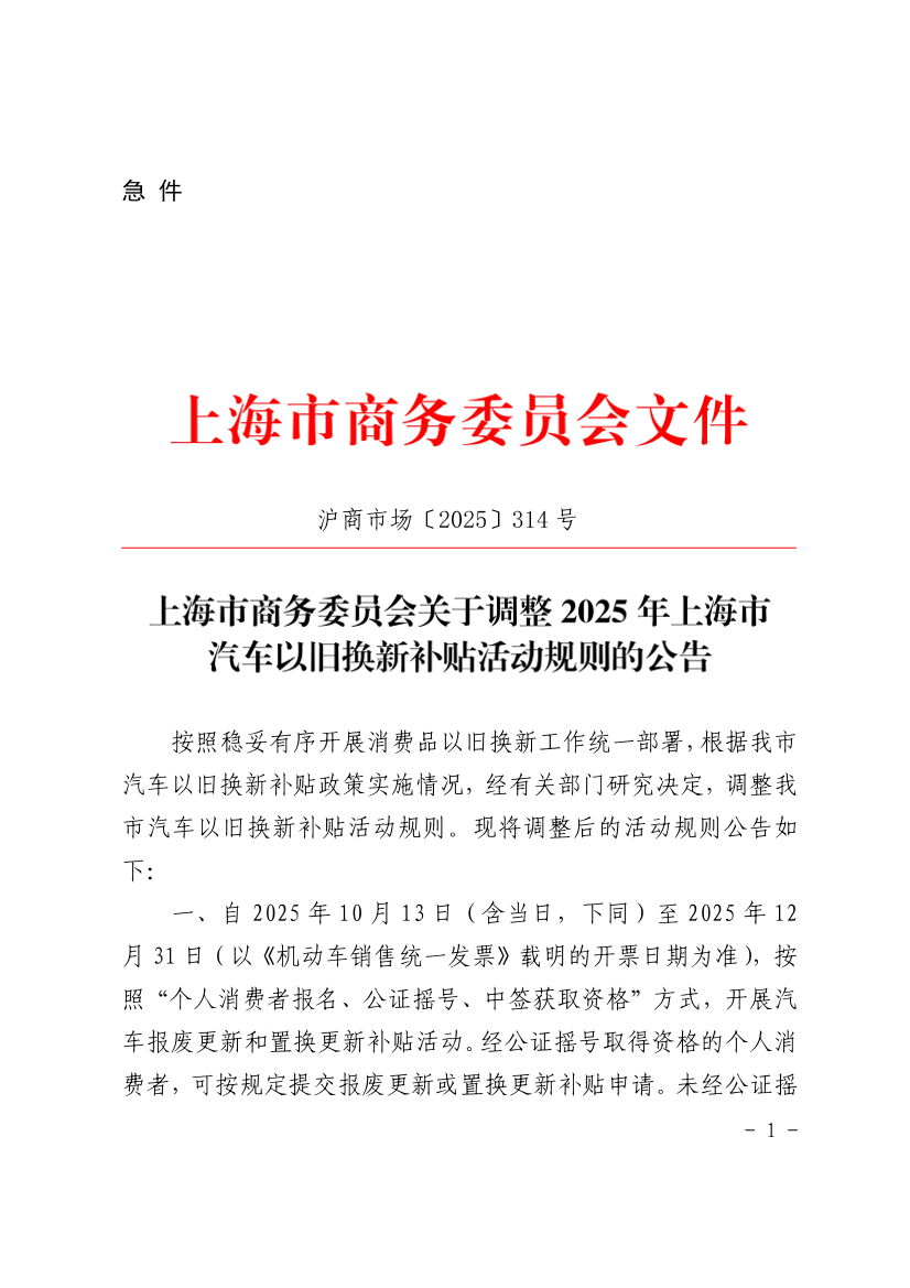 本公告未规定事项,仍按《2025年上海市落实国家汽车报废更新补贴政策实施细则》(沪商市场〔2025〕20号)、《2025年上海市汽车置换更新补贴政策实施细则》(沪商市场〔2025〕21号)及《2025年上海市进一步支持汽车置换更新补贴政策实施细则》(沪商市场〔2025〕284号)的有关规定执行。本公告由上海市商务委员会负责解释。