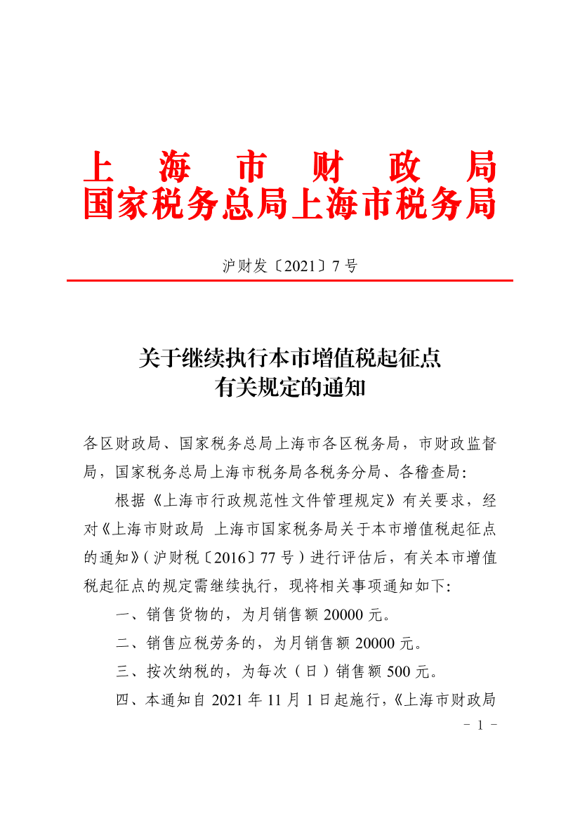 四、本通知自2021年11月1日起施行,《上海市财政局上海市国家税务局关于本市增值税起征点的通知》(沪财税〔2016〕77号)相应废止。销售服务、无形资产或者不动产的增值税起征点,按照《上海市财政局国家税务总局上海市税务局关于继续执行全面推开营改增试点后本市增值税起征点有关规定的通知》(沪财发〔2021〕2号)规定执行。