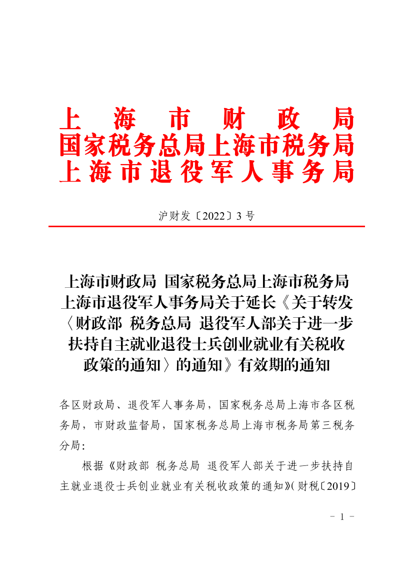 根据《财政部税务总局退役军人部关于进一步扶持自主就业退役士兵创业就业有关税收政策的通知》(财税〔2019〕21号)和《财政部税务总局关于延长部分税收优惠政策执行期限的公告》(2022年第4号公告)相关规定,经评估并报经市政府同意,《上海市财政局国家税务总局上海市税务局上海市退役军人事务局关于转发〈财政部税务总局退役军人部关于进一步扶持自主就业退役士兵创业就业有关税收政策的通知〉的通知》(沪财发〔2019〕2号)需继续实施,有效期延长至2023年12月31日,文中规定的税收政策执行期限相应延长至2023年12月31日。