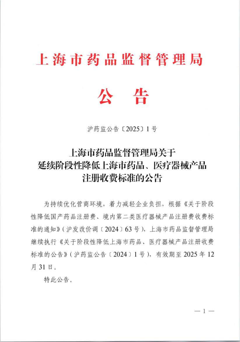 为持续优化营商环境,着力减轻企业负担,根据《关于阶段性降低国产药品注册费、境内第二类医疗器械产品注册费收费标准的通知》(沪发改价调﹝2024﹞63号),上海市药品监督管理局继续执行《关于阶段性降低上海市药品、医疗器械产品注册收费标准的公告》(沪药监公告﹝2024﹞1号),有效期至2025年12月31日。
