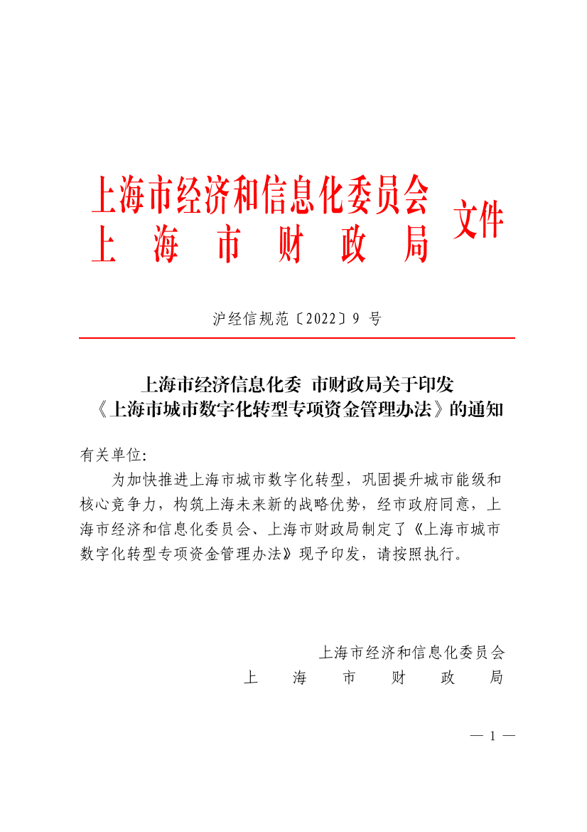 为加快推进上海市城市数字化转型,巩固提升城市能级和核心竞争力,构筑上海未来新的战略优势,经市政府同意,上海市经济和信息化委员会、上海市财政局制定了《上海市城市数字化转型专项资金管理办法》,现予印发,请按照执行。