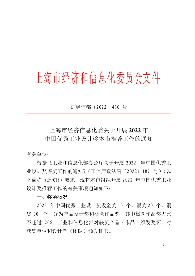 根据《工业和信息化部办公厅关于开展2022年中国优秀工业设计奖评奖工作的通知》(工信厅政法函〔2022〕187号)(以下简称《通知》)要求,现将本市组织开展2022年中国优秀工业设计奖推荐工作的有关事项通知如下: