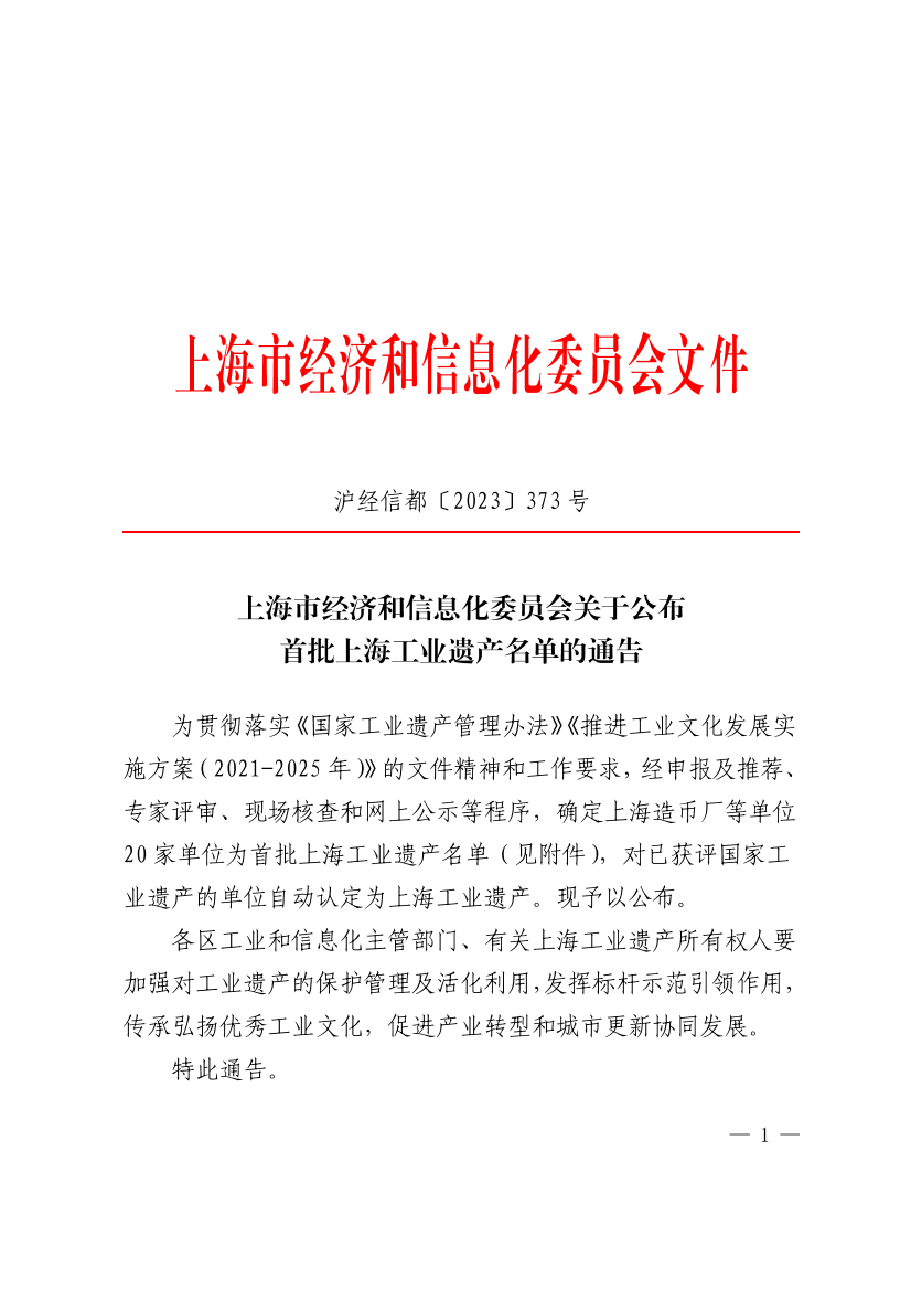 为贯彻落实《国家工业遗产管理办法》《推进工业文化发展实施方案(2021-2025年)》的文件精神和工作要求,经申报及推荐、专家评审、现场核查和网上公示等程序,确定上海造币厂等单位20家单位为首批上海工业遗产名单(见附件),对已获评国家工业遗产的单位自动认定为上海工业遗产。现予以公布。