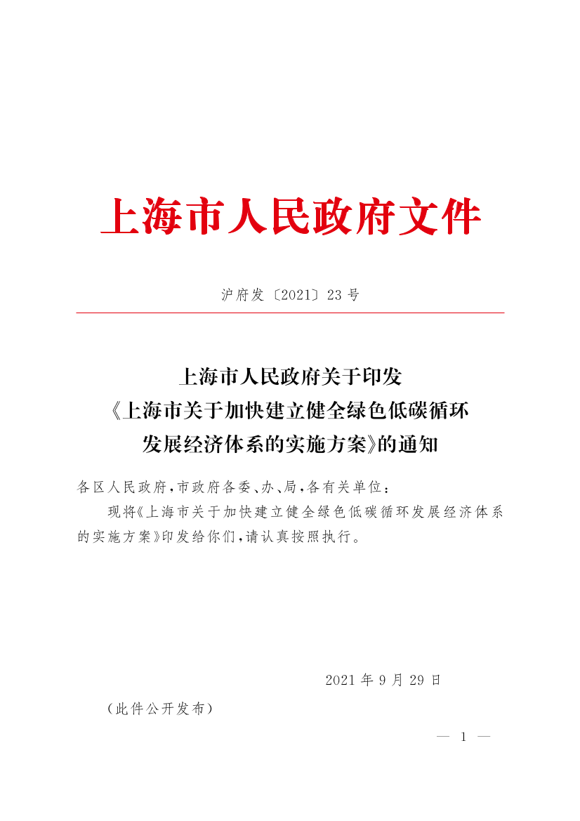 上海市人民政府关于印发《上海市关于加快建立健全绿色低碳循环发展经济体系的实施方案》的通知