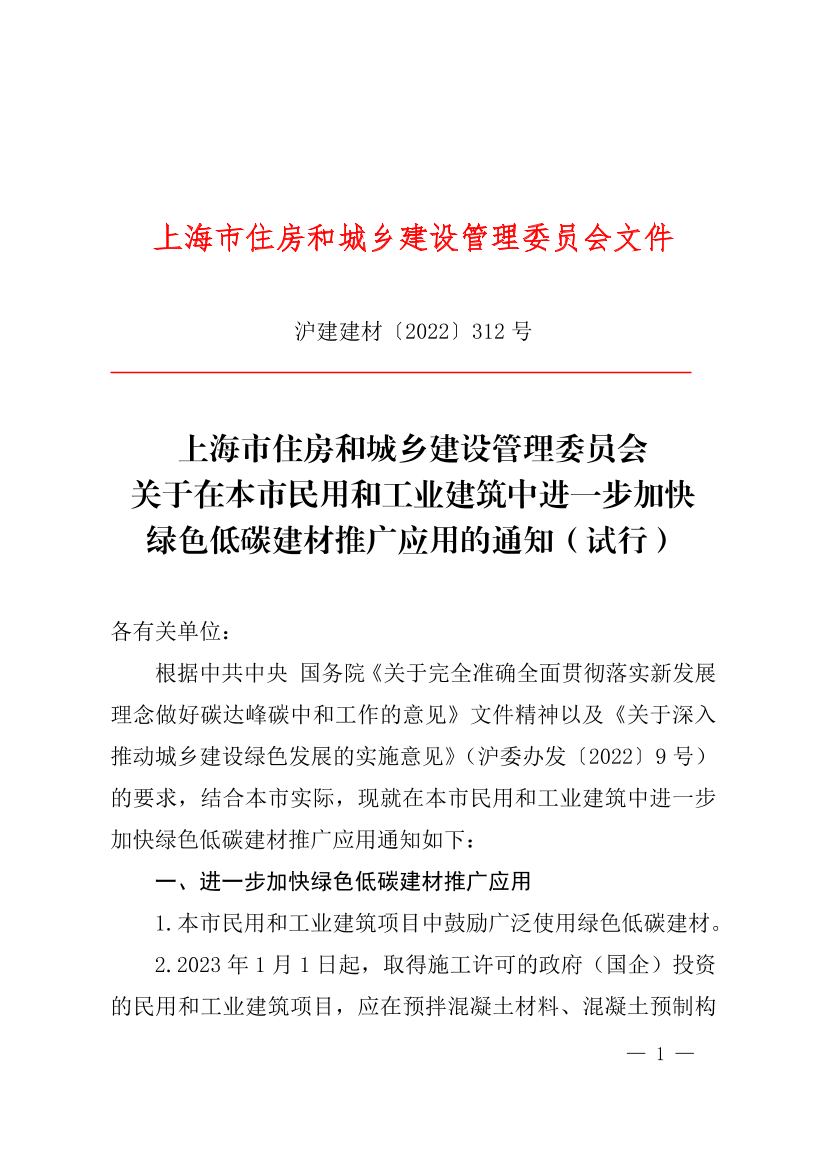 根据中共中央、国务院《关于完全准确全面贯彻落实新发展理念做好碳达峰碳中和工作的意见》文件精神以及《关于深入推动城乡建设绿色发展的实施意见》(沪委办发〔2022〕9号)的要求,结合本市实际,现就在本市民用和工业建筑中进一步加快绿色低碳建材推广应用通知如下: