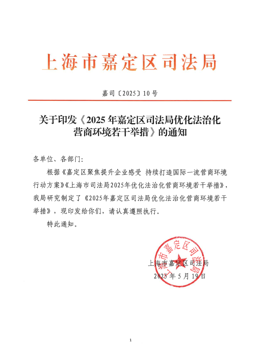 为认真贯彻落实《嘉定区聚焦提升企业感受 持续打造国际一流营商环境行动方案》《上海市司法局2025年优化法治化营商环境若干举措》,推进一流法治化营商环境建设,结合嘉定区司法行政工作实际,制定如下举措。