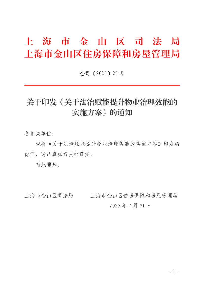 小区物业治理事关民生福祉、基层治理和城市品质。为全面服务保障全区物业治理工作持续向法治化、规范化轨道深入拓展,根据《上海市住宅物业管理规定》《关于印发<金山区党建引领小区物业治理“六力提升”专项行动方案>的通知》(金委组〔2025〕97号)《关于印发<关于促进金山区住宅物业高质量发展的实施意见>的通知》(金房管规〔2024〕63号),制定关于法治赋能提升物业治理效能的实施方案。