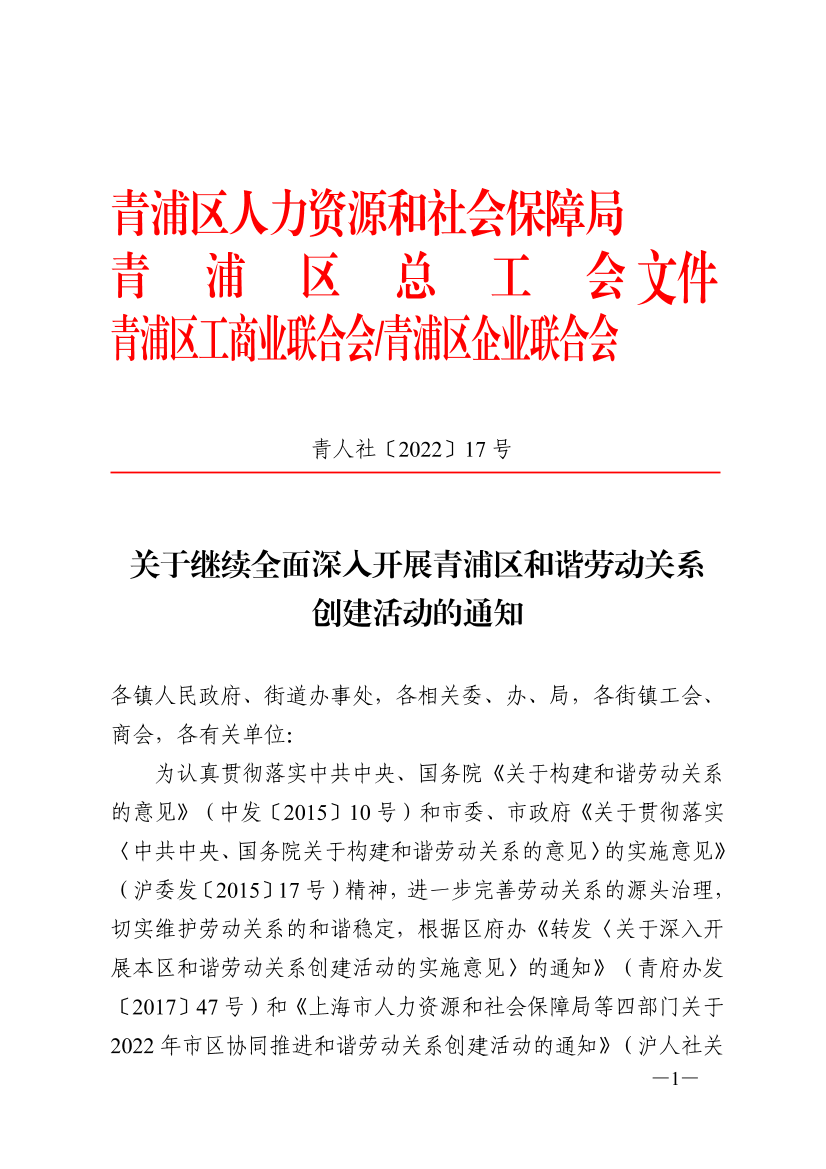 为认真贯彻落实中共中央、国务院《关于构建和谐劳动关系的意见》(中发〔2015〕10号)和市委、市政府《关于贯彻落实〈中共中央、国务院关于构建和谐劳动关系的意见〉的实施意见》(沪委发〔2015〕17号)精神,进一步完善劳动关系的源头治理,切实维护劳动关系的和谐稳定,根据区府办《转发〈关于深入开展本区和谐劳动关系创建活动的实施意见〉的通知》(青府办发〔2017〕47号)和《上海市人力资源和社会保障局等四部门关于2022年市区协同推进和谐劳动关系创建活动的通知》(沪人社关〔2022〕107号)要求,现就继续全面深入开展本区和谐劳动关系创建活动的有关事项通知如下。