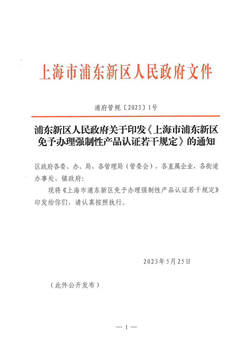浦东新区人民政府关于印发《上海市浦东新区免予办理强制性产品认证若干规定》的通知