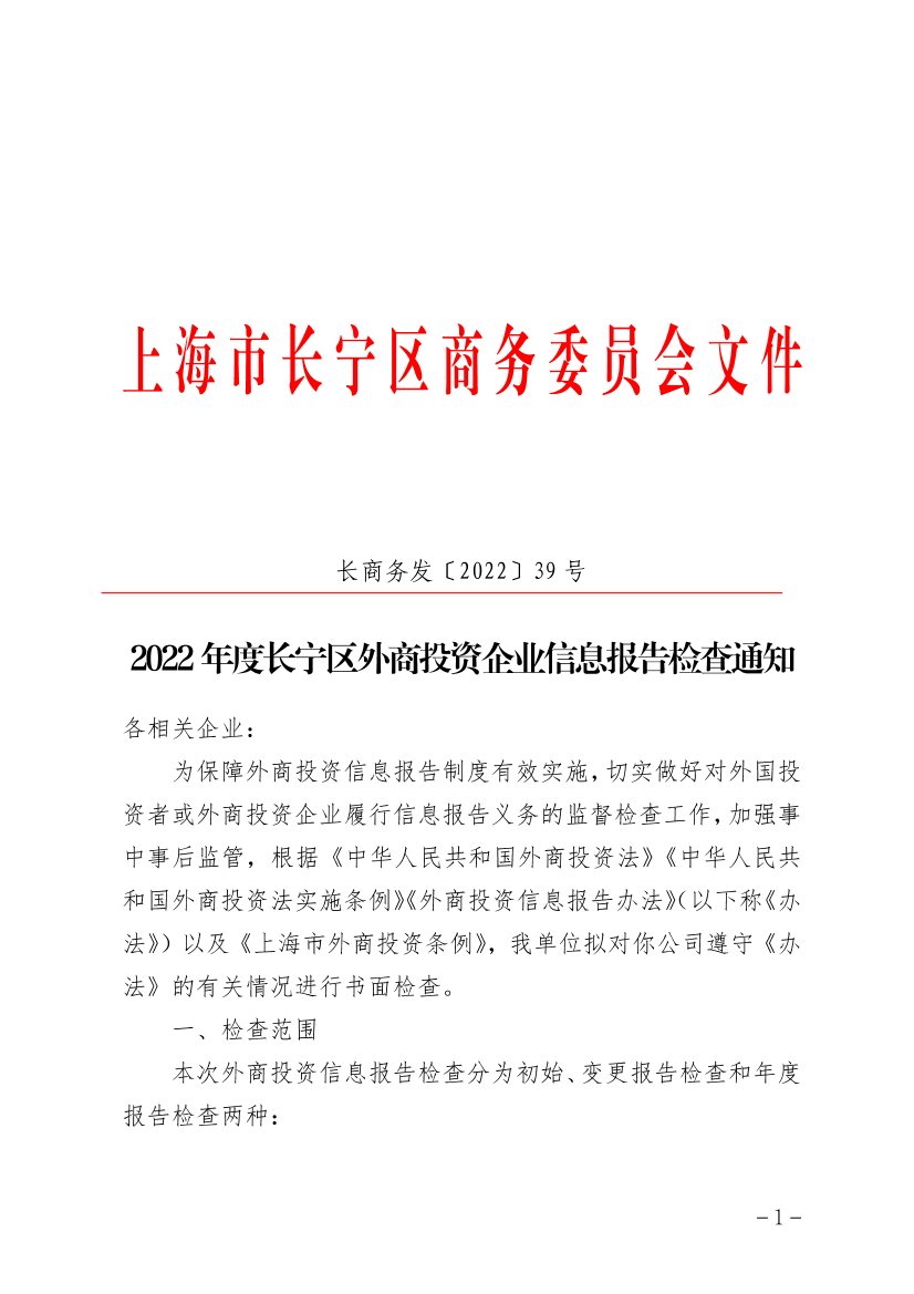 为保障外商投资信息报告制度有效实施,切实做好对外国投资者或外商投资企业履行信息报告义务的监督检查工作,加强事中事后监管,根据《中华人民共和国外商投资法》《中华人民共和国外商投资法实施条例》《外商投资信息报告办法》(以下称《办法》)以及《上海市外商投资条例》,我单位拟对你公司遵守《办法》的有关情况进行书面检查。