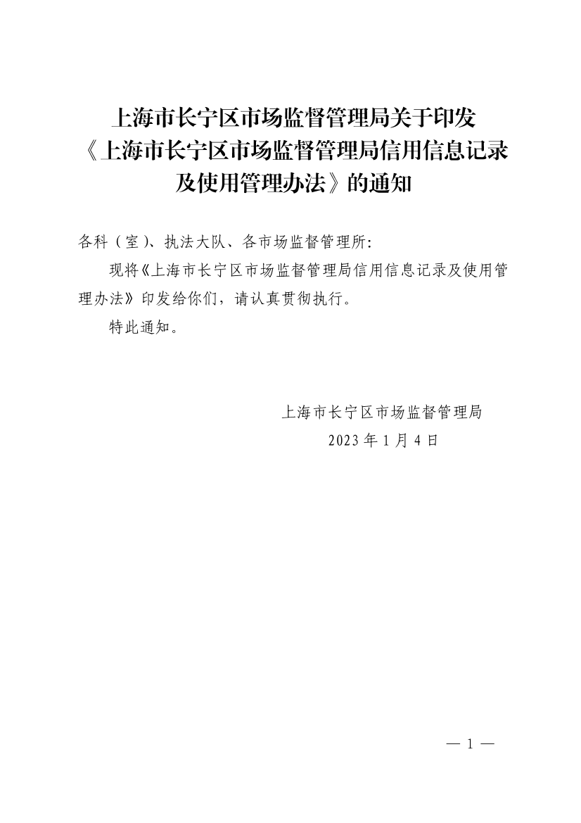 上海市长宁区市场监督管理局关于印发《上海市长宁区市场监督管理局信用信息记录及使用管理办法》的通知