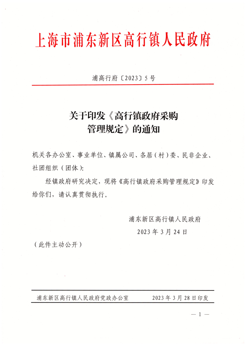 经镇政府研究决定,现将《高行镇政府采购管理规定》印发给你们,请认真贯彻执行。