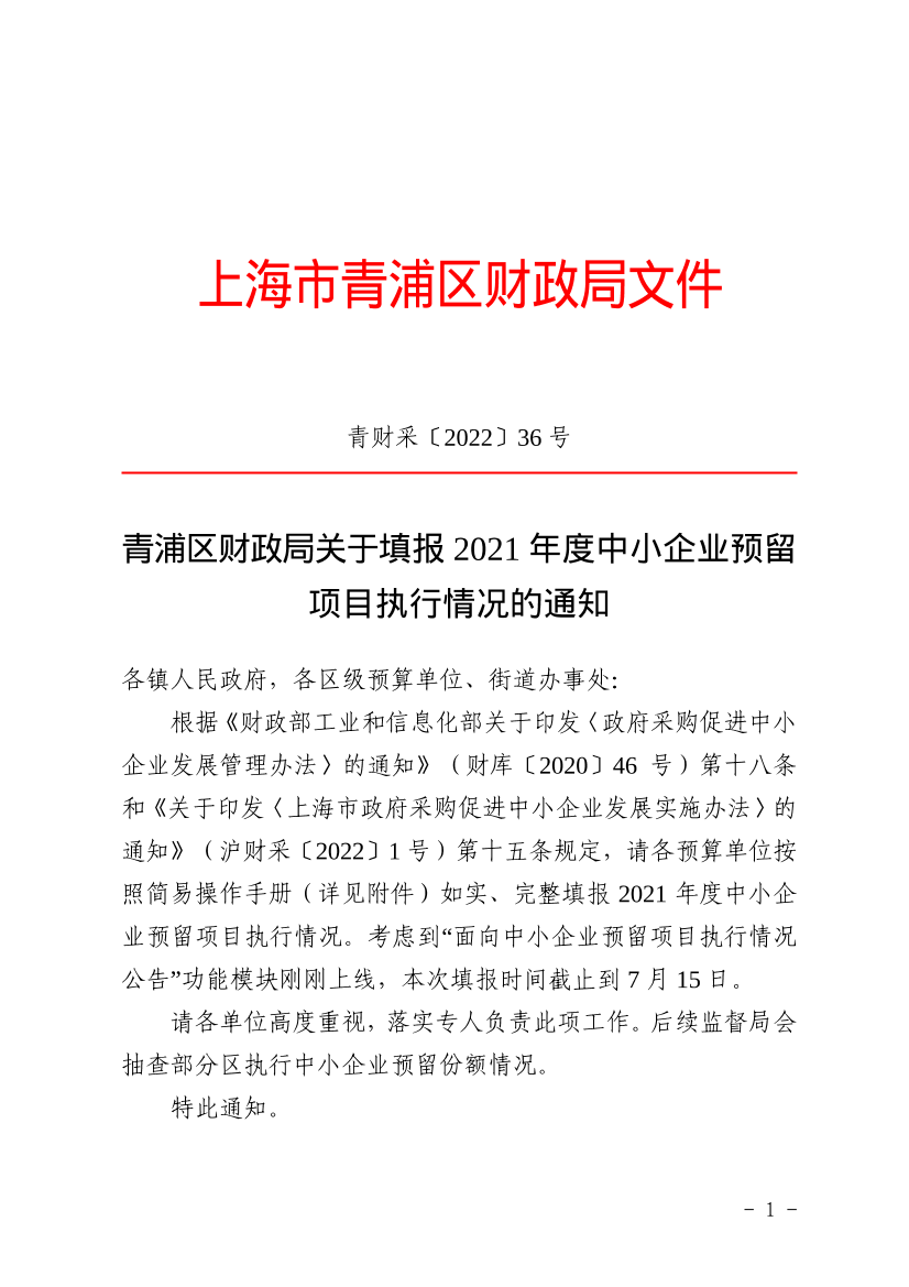 根据《财政部工业和信息化部关于印发〈政府采购促进中小企业发展管理办法〉的通知》(财库〔2020〕46号)第十八条和《关于印发〈上海市政府采购促进中小企业发展实施办法〉的通知》(沪财采〔2022〕1号)第十五条规定,请各预算单位按照简易操作手册(详见附件)如实、完整填报2021年度中小企业预留项目执行情况。考虑到“面向中小企业预留项目执行情况公告”功能模块刚刚上线,本次填报时间截止到7月15日。
