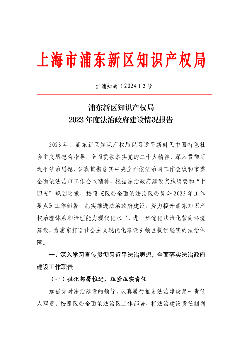 2023年,浦东新区知识产权局以习近平新时代中国特色社会主义思想为指导,全面贯彻落实党的二十大精神,深入贯彻习近平法治思想,认真贯彻落实中央全面依法治国工作会议和市委全面依法治市工作会议精神,根据法治政府建设实施纲要和“十四五”规划要求,按照《区委全面依法治区委员会2023年工作要点》工作部署,扎实推进法治政府建设,努力提升浦东知识产权治理体系和治理能力现代化水平,进一步优化法治化营商环境建设,为浦东打造社会主义现代化建设引领区提供坚实的法治保障。