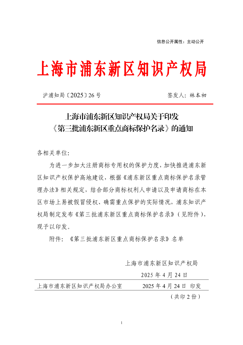 为进一步加大注册商标专用权的保护力度,加快推进浦东新区知识产权保护高地建设,根据《浦东新区重点商标保护名录管理办法》相关规定,结合部分商标权利人申请以及申请商标在本区市场上易被假冒侵权、确需重点保护的实际情况,浦东知识产权局制定发布《第三批浦东新区重点商标保护名录》(见附件),现予以印发。