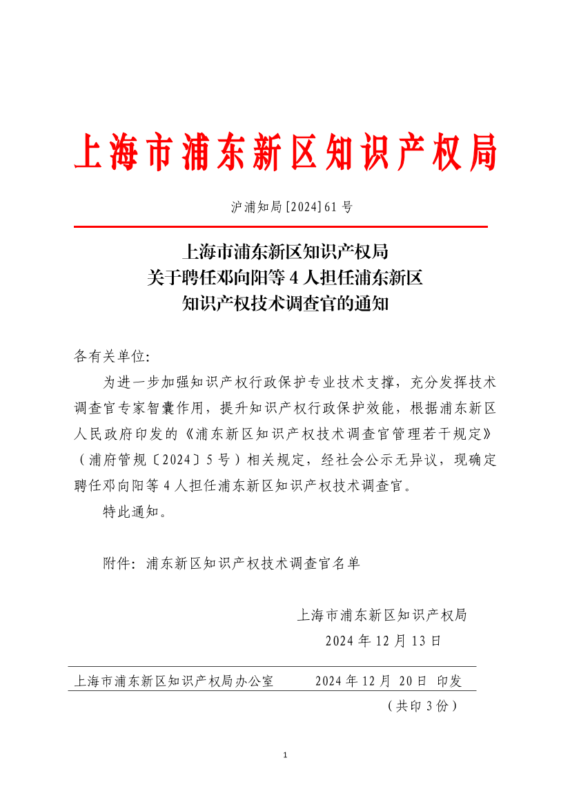 为进一步加强知识产权行政保护专业技术支撑,充分发挥技术调查官专家智囊作用,提升知识产权行政保护效能,根据浦东新区人民政府印发的《浦东新区知识产权技术调查官管理若干规定》(浦府管规〔2024〕5号)相关规定,经社会公示无异议,现确定聘任邓向阳等4人担任浦东新区知识产权技术调查官。