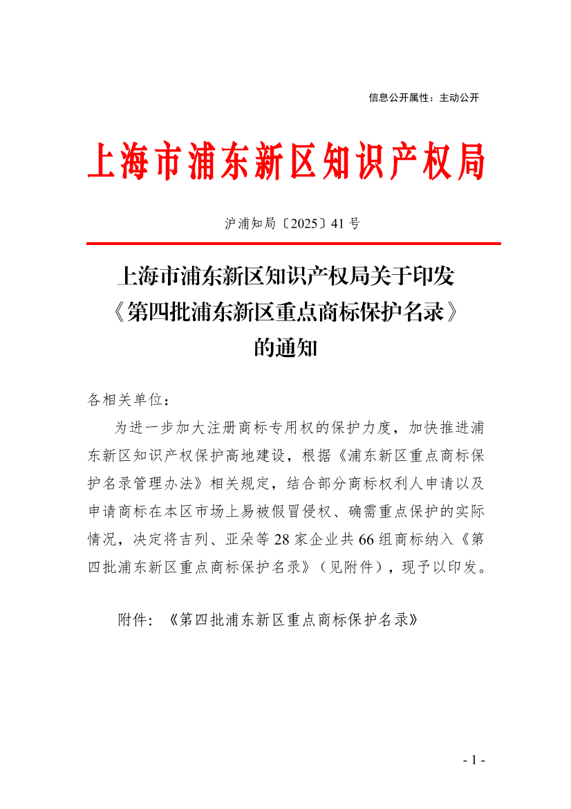 为进一步加大注册商标专用权的保护力度,加快推进浦东新区知识产权保护高地建设,根据《浦东新区重点商标保护名录管理办法》相关规定,结合部分商标权利人申请以及申请商标在本区市场上易被假冒侵权、确需重点保护的实际情况,决定将吉列、亚朵等28家企业共66组商标纳入《第四批浦东新区重点商标保护名录》(见附件),现予以印发。
