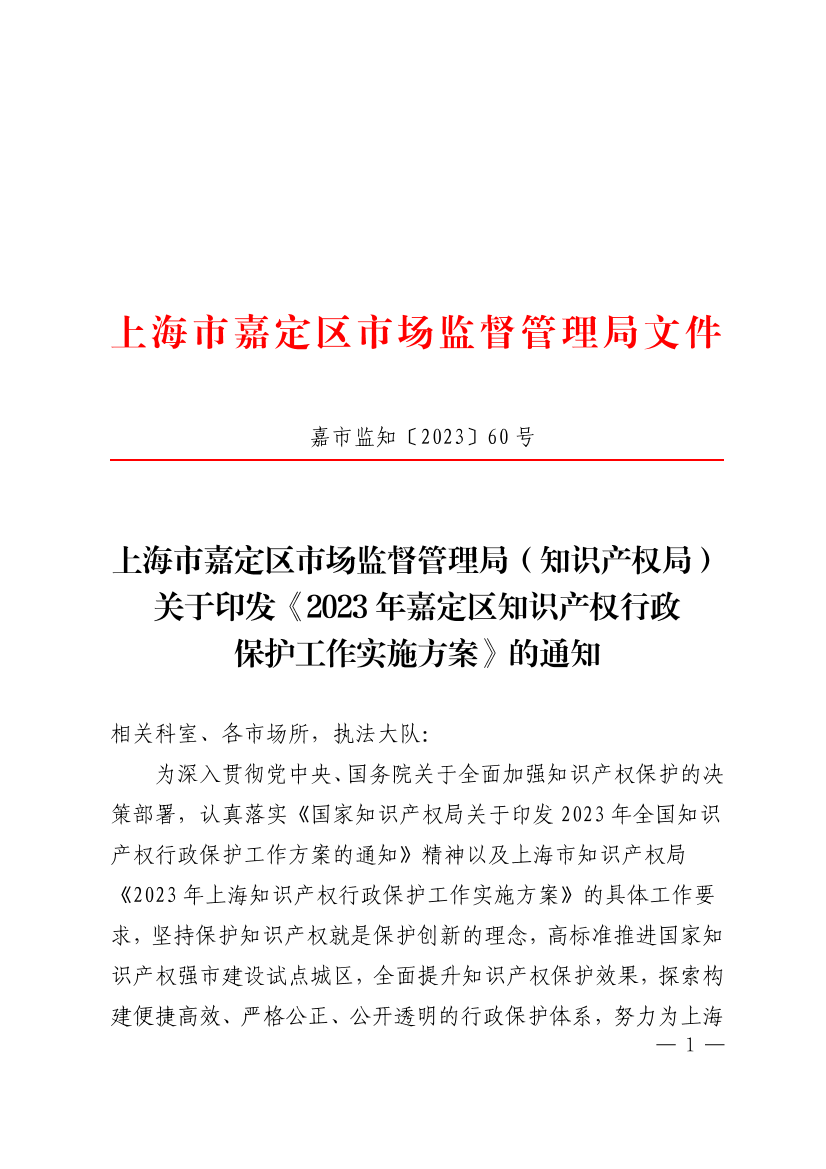 上海市嘉定区市场监督管理局(知识产权局)关于印发《2023年嘉定区知识产权行政保护工作实施方案》的通知