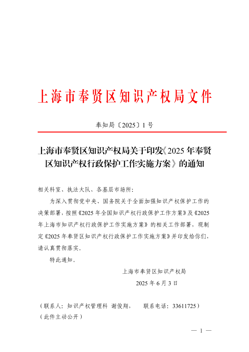 为深入贯彻党中央、国务院关于全面加强知识产权保护工作的决策部署,按照《2025年全国知识产权行政保护工作方案》及《2025年上海市知识产权行政保护工作实施方案》的相关工作部署,现制定《2025年奉贤区知识产权行政保护工作实施方案》并印发给你们,请认真贯彻落实。