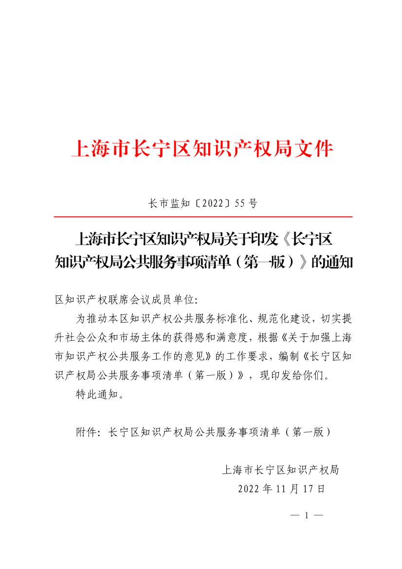 关于印发《长宁区知识产权局公共服务事项清单(第一版)》的通知