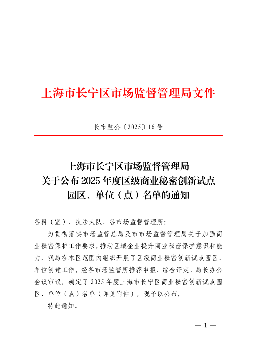 上海市长宁区市场监督管理局关于公布2025年度区级商业秘密创新试点园区、单位(点)名单的通知