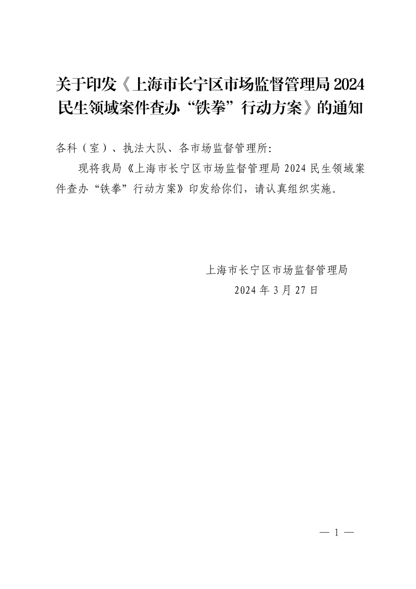 关于印发《上海市长宁区市场监督管理局2024民生领域案件查办“铁拳”行动方案》的通知