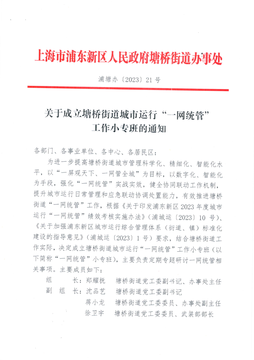 为进一步提高塘桥街道城市管理科学化、精细化、智能化水平,以“一屏观天下、一网管全城”为目标,以数字化、智能化为手段,强化“一网统管”实战实效,健全协同联动工作机制,提升城市运行日常管理和应急联动协调处置能力,有效推进塘桥街道“一网统管”工作,根据《关于印发浦东新区2023年度城市运行“一网统管”绩效考核实施办法》(浦城运〔2023〕10号)、《关于加强浦东新区城市运行综合管理体系(街道、镇)标准化建设的指导意见》(浦城运〔2023〕1号)要求,结合塘桥街道工作实际,决定成立塘桥街道城市运行“一网统管”工作小专班(以下简称“一网统管”小专班),主要负责定期专题研讨一网统管相关事项。主要成员如下: