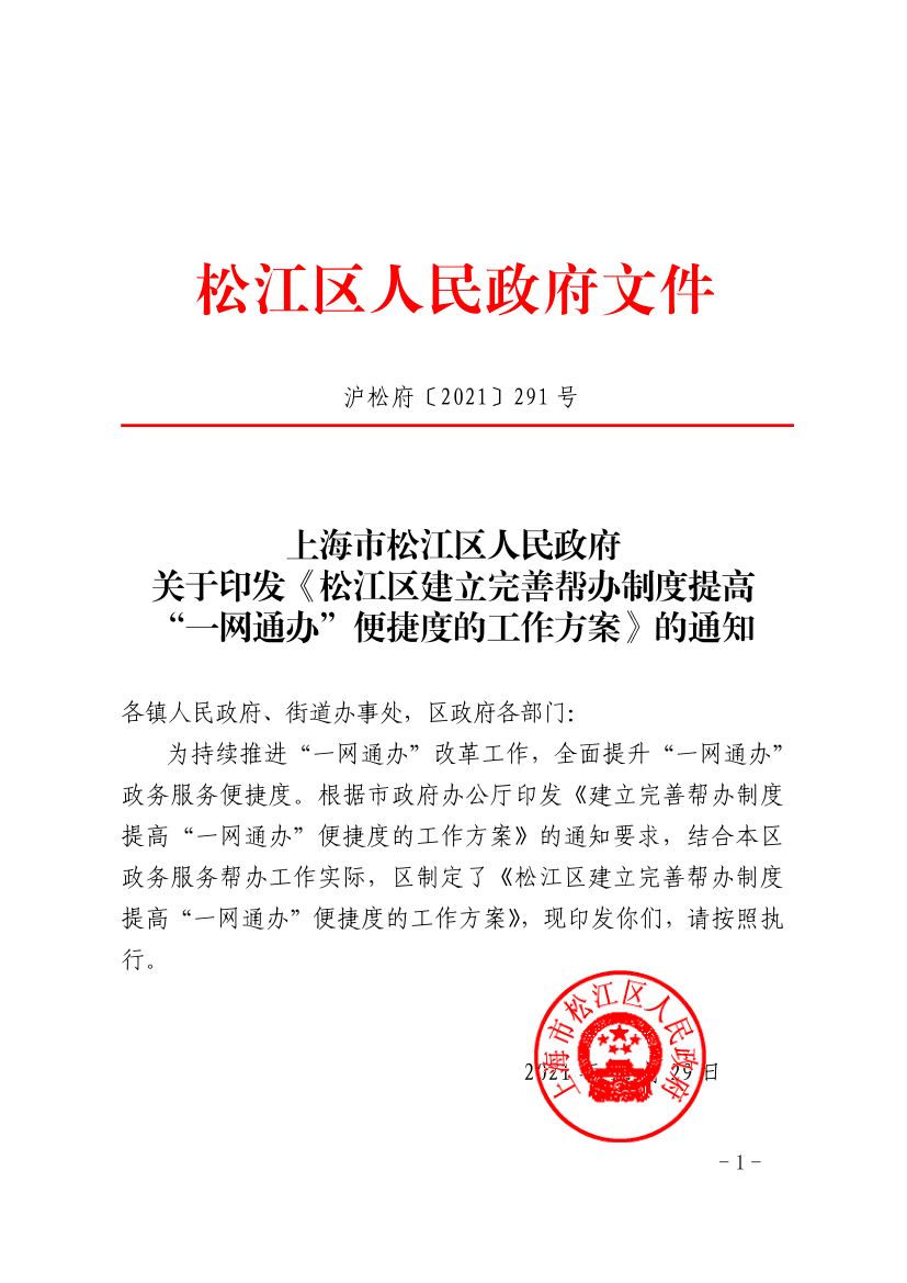 关于印发《松江区建立完善帮办制度提高“一网通办”便捷度的工作方案》的通知