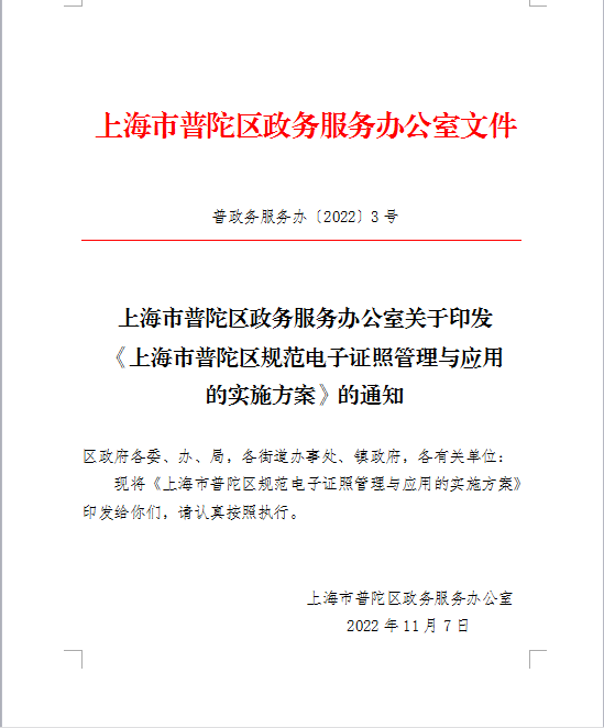 现将《上海市普陀区规范电子证照管理与应用的实施方案》印发给你们,请认真按照执行。