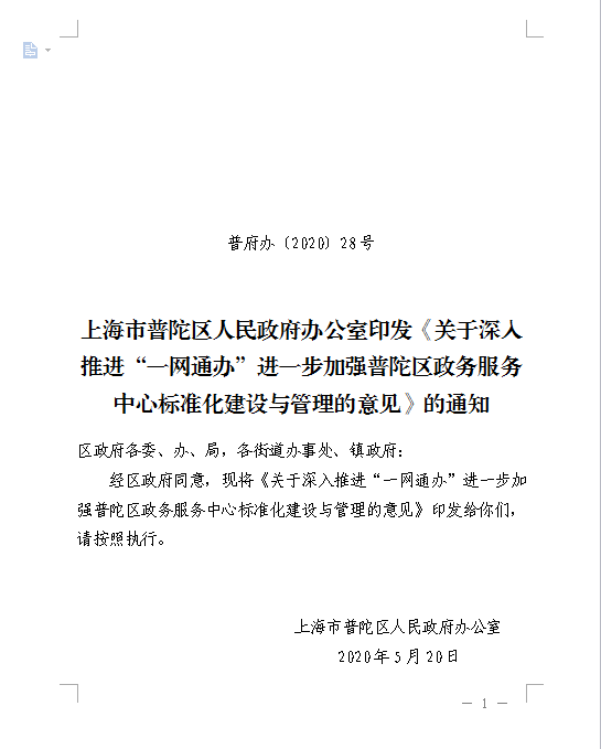 关于深入推进“一网通办” 进一步加强普陀区政务服务中心标准化建设与管理的意见